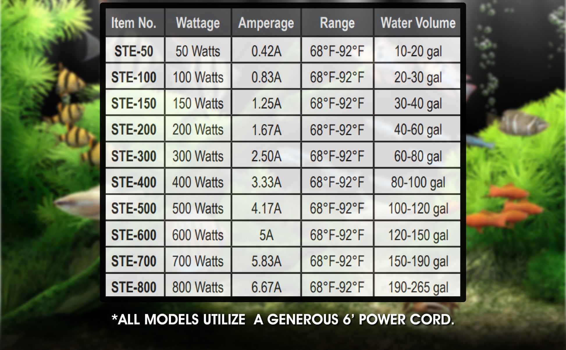 The STE Titanium Aquarium heater series is ETL listed to UL Standards. The STE uses an advanced digital processor that monitors and controls the water temperature in your aquarium. The heating controller receives temperature data from the remote sensor in the aquarium. The remote sensor contains no bi-metallic contacts to arc, corrode or wear out. This allows STE heaters to have precise control, keeping the water temperature stable (± 1°F accuracy) while avoiding wide temperature swings common with low-quality aquarium heaters. The controller displays the current temperature, allowing you to easily make temperature adjustments on the front panel. Temperature can be adjusted by a one degree. STE heaters utilize Redundancy Protection. In the rare occasion one component fails, the second component takes over. This safety feature prevents over-heating of the aquarium, saving your prized aquarium life from harm. The heater is constructed of corrosion-resistant titanium, making it safe for freshwater and marine aquariums. The heater tube is virtually unbreakable and wonât be damaged by bumps from live rock or big fish. The STE Series was awarded Editor's Choice from AquariumStoreDepot.comÂ